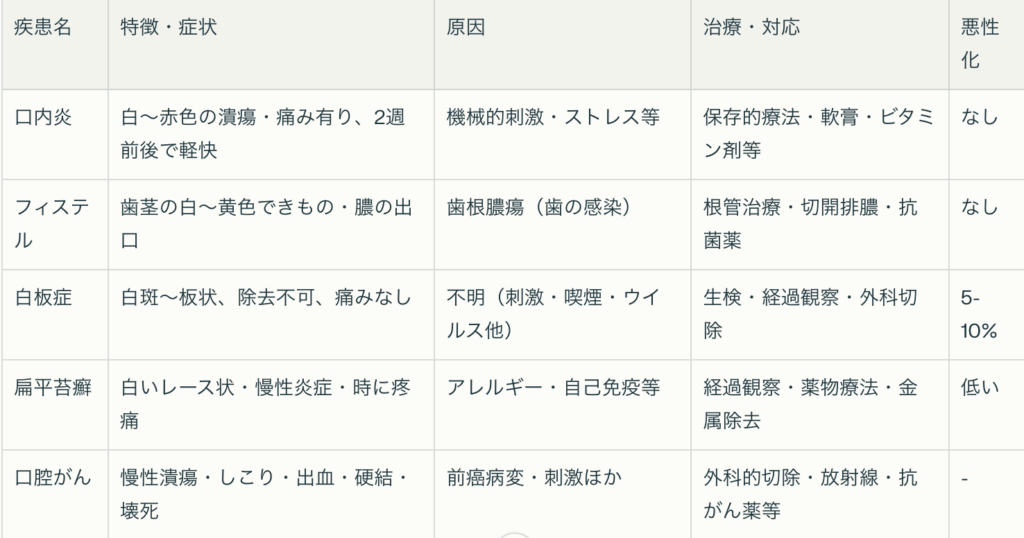 口内炎と似ている口腔疾患:フィステル・白板症・扁平苔癬・口腔がん